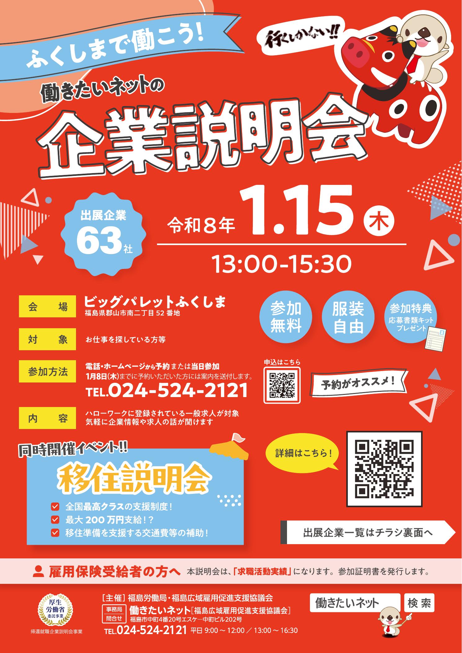 令和8年1月15日㈭ ビックパレットふくしまで開催される『ふくしまで働こう企業説明会』へ出展いたします。