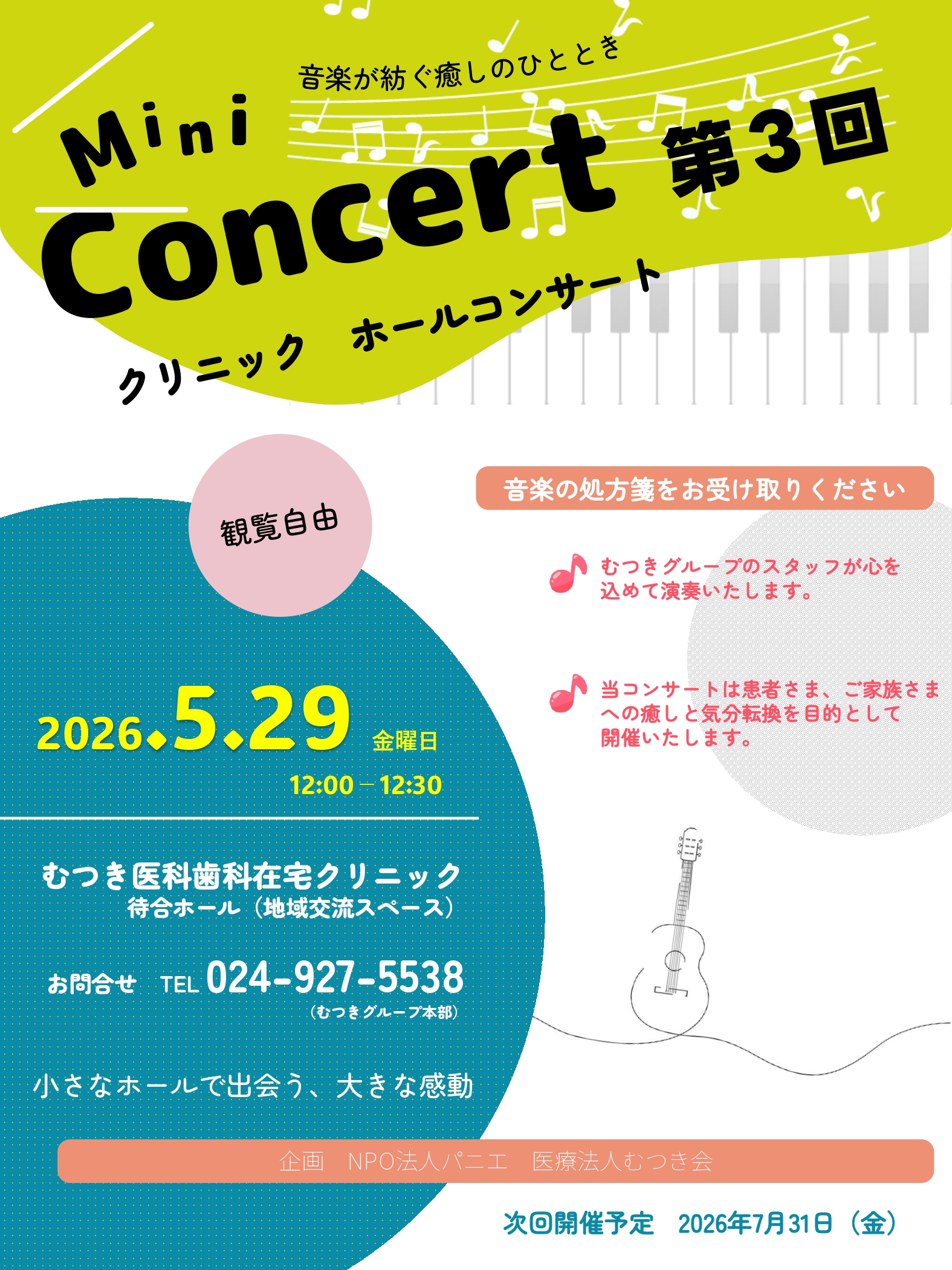 医療法人 むつき会|福島県郡山市お知らせ法人よりクリニック ホールコンサート 開催のご案内 2026.4.28 法人より クリニック ホールコンサート 開催のご案内 第3回クリニックホールコンサートを開催いたします。 観覧自由です。お気軽にお越しください。 ♫ 当コンサートは患者さま、ご家族さまへの癒しと気分転換を目的として開催いたします。 ♪ 癒しの音楽の処方箋をお受け取りください。 お知らせ一覧へ戻る 前の投稿